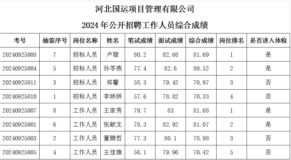 根據(jù)《河北國運(yùn)項(xiàng)目管理有限公司公開招聘工作人員招聘公告》規(guī)定,河北國運(yùn)項(xiàng)目管理有限公司2024年公開招聘工作人員面試于2024年9月25日完成?,F(xiàn)將綜合成績及進(jìn)入體檢人員名單進(jìn)行公示。